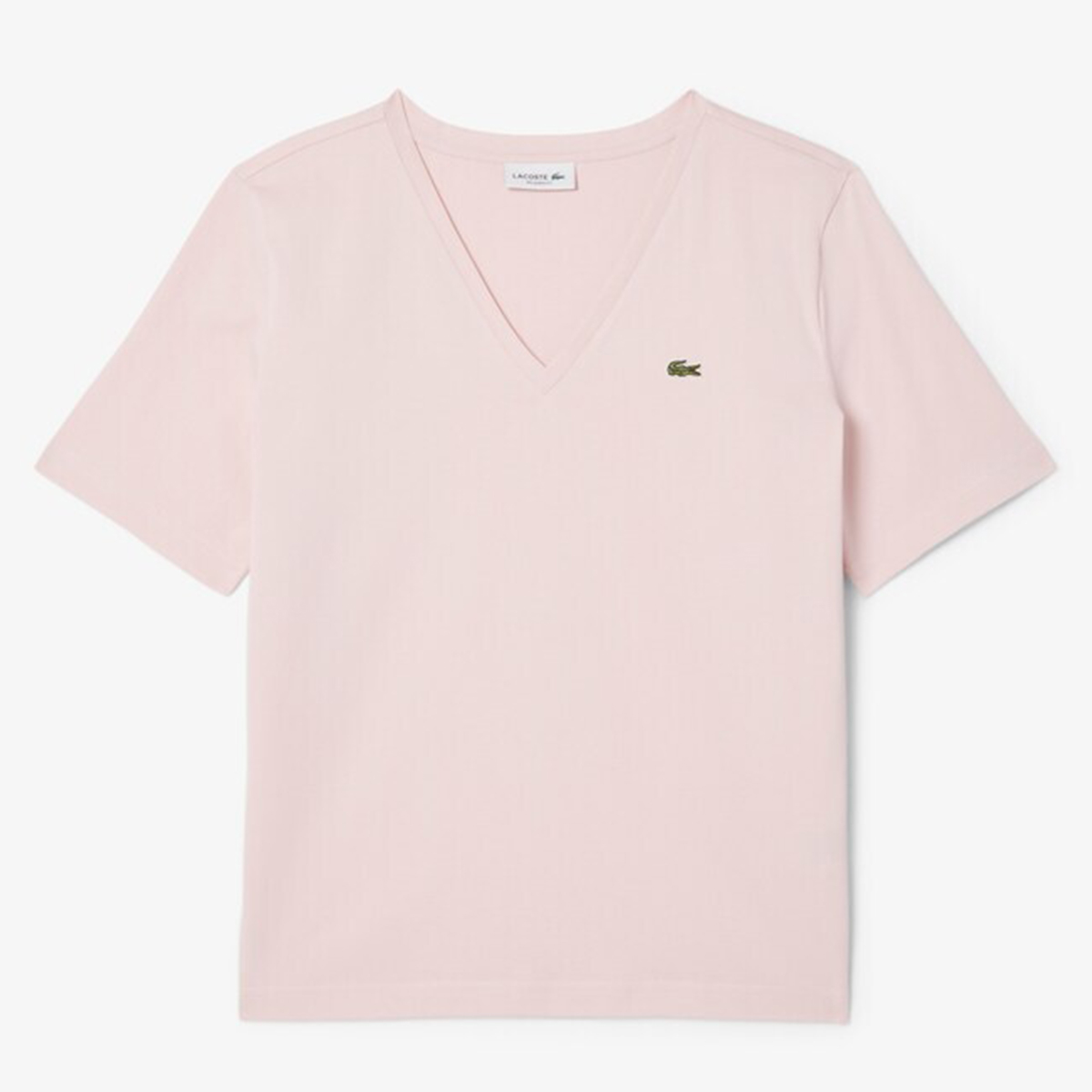 48,00€T-shirt rosa Lacoste da donna in morbido cotone, modello relaxed fit con scollo a V e coccodrillo ricamato. Casual, femminile e versatile.
