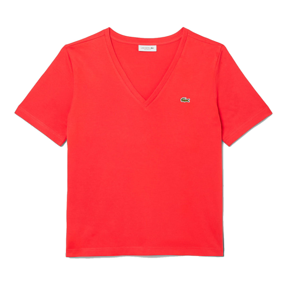 46,40€T-shirt femminile Lacoste, in cotone, con scollo a V, color rosso aragosta: un fiore all'occhiello del tuo guardaroba estivo!
