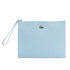Pochette Anna Lacoste blu unisex in canvas piqué spalmato con zip, tasca interna e manico da polso. Elegante, leggera e versatile.