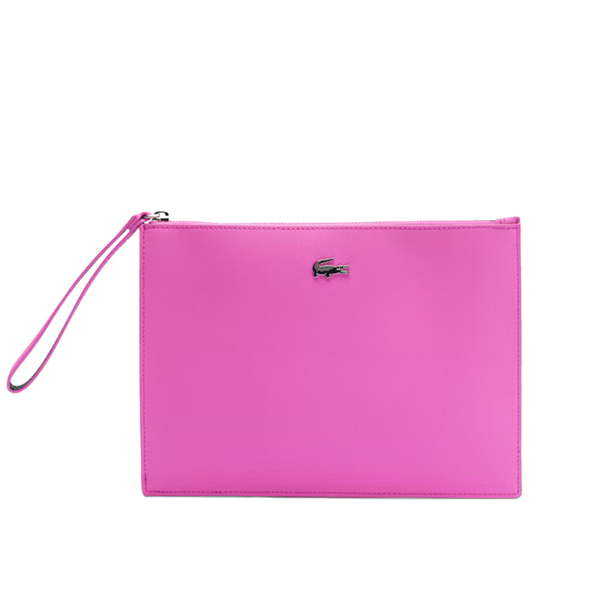 Pochette Lacoste Anna in canvas piqué rosa con zip e manico da polso, compatta e capiente, ideale come accessorio unisex da giorno o da sera.