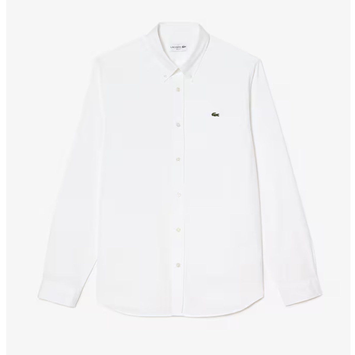 99,00€Camicia Lacoste uomo CH562000 slim fit in cotone pinpoint bianco, elegante e raffinata, con colletto a bottoni e dettagli in madreperla.
